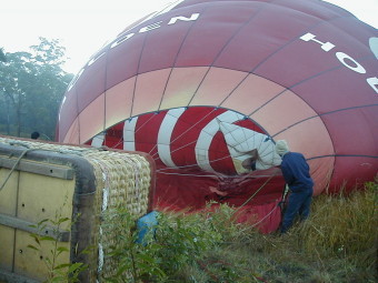 5時10分、頼んでいたモーニングコールが入る。着替えたものの、ほとんど寝たままの子どもを連れてロビーに下りる。5時35分、予定より5分早く迎えの車がきた。大きな人のよさそうなお兄さんが威勢良く迎えてくれる。後ろに10人、前に無理すれば3人乗れるオフロードカーの後ろに熱気球のバスケットを乗せた台を牽引している。僕達が最初のお客で、車内には誰もいなかった。
