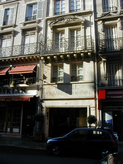 背中の荷物は重く、余裕のなくなってきた僕はパン屋のおばさんが店の外に出てきたのをつかまえてチケットを見せ、場所を聞く。フランス語で説明をしてくれたが、もちろん、さっぱり分からない。ただ、指差した方向だけは分かっているのでそっちに向かって歩いていくと、カフェとバーに挟まれた小さなホテルの入り口があった。ここがパリでお世話になる「Hotel Louvre ST Honer」である。なんと、地図上で同じブロックになっているホテルと3ブロックも違っていた。