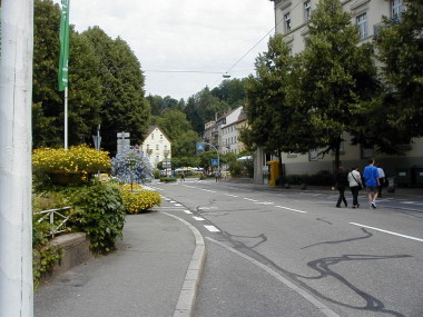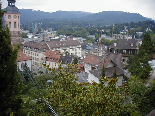 でわ、本日の議題(でもないか)、黒い森を。実は昨日のページで、「黒い森の入り口」と書いたが、正確に言うと、バーデンバーデン自身がすでに黒い森の中に位置する。だから、街中から周辺へ散歩道があればそれはすべて黒い森へと続いているのだ。そして、バーデンバーデンはその散歩を楽しめるように、それこそ車椅子でも森を楽しめるよう、遊歩道が整備されている。まあ、そんなに森の奥深くに入るのではなく、街の周りをちょっとまわるくらいのものではあるが。でも、観光に行くでもなく、ただ、森の中を緑に包まれて歩くのは気持ちのいいものである。犬を連れて散歩をしている人に混じってゆっくりと散歩してまわる。くるっと街の上側の道に出ると、バーデンバーデンの街並みが一望できる。