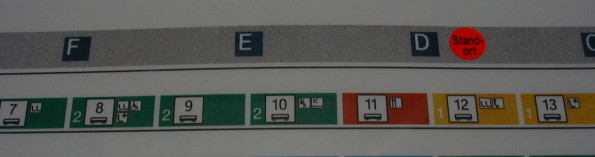 ホームの上にDとかEとかの表示が出ているのが分かるでしょうか。さっきの編成表の上に書いてあるABCがこれです。完璧に一致と言うわけにはいきませんが、目安です。なお、ホームにある行き先案内の下にも出ますが、これは列車のつながりだけで、入る場所はあてになりません。まるっきり反対という事もあります。