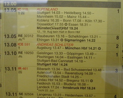 これは駅の表示ボード。これでも分かりますが、ごらんのように13:05発の列車は単にICしか書いていません。もっと大きな駅なら列車番号まで出るのでより確実ですが。ちなみに、バーデンバーデン等のような小さな駅にはこのボードも各ホームの表示もありませんから、さっきの時刻表だけが頼りです。