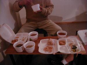 グリンデルワルトに帰ると夕食を食べに出る。と、ホテルの前に和食を売っている屋台が出ているではないか。おにぎりとのり弁当、うどん、お茶を売っていた。ここで一通り買って、ホテルに持ち帰り、食べる事にした。