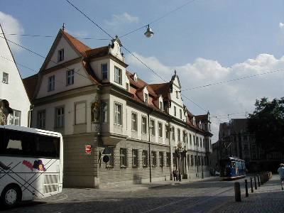 アウグスブルグの街並み。石造りの中世の街並みの間を車と路面電車が走る。表通りより裏通りに入ると、いろいろと面白い店が結構ある。うろつくならひとつ裏に入った通りが面白いかも知れない。
