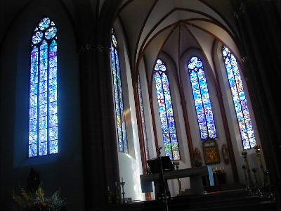 これが噂のステンドグラス。青を基調にした、珍しいものだ。通常、教会のステンドグラスはどちらかと言うと暖色が基調になっている事が多い。ステンドグラスが寒色のためか、室内に使われている柱には赤いレンガが使用されていた。今まで見てきた教会とは少し雰囲気の違う教会だった。
